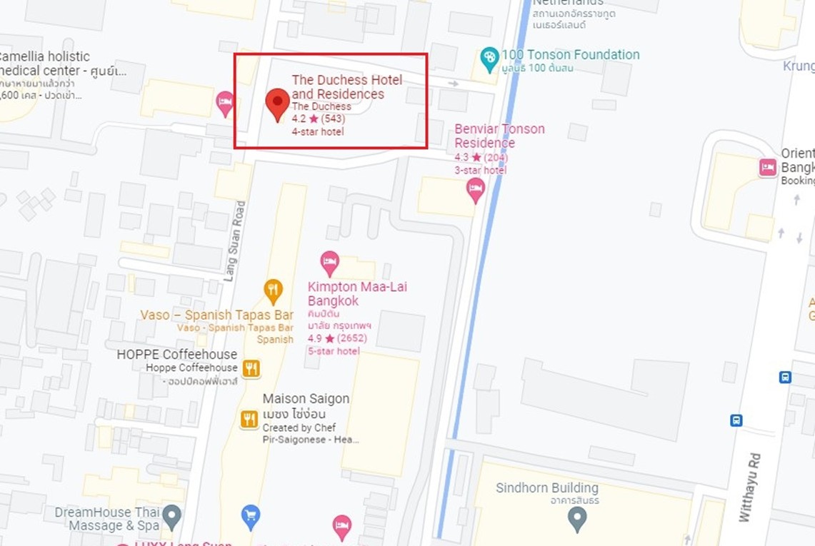 บริษัท อัคร ฮอสพิแทลลิตี้ จำกัด 61 The Duchess Hotel ถ.หลังสวน แขวงลุมพินี เขตปทุมวัน จังหวัดกรุงเทพมหานคร 10120 ประเทศไทย