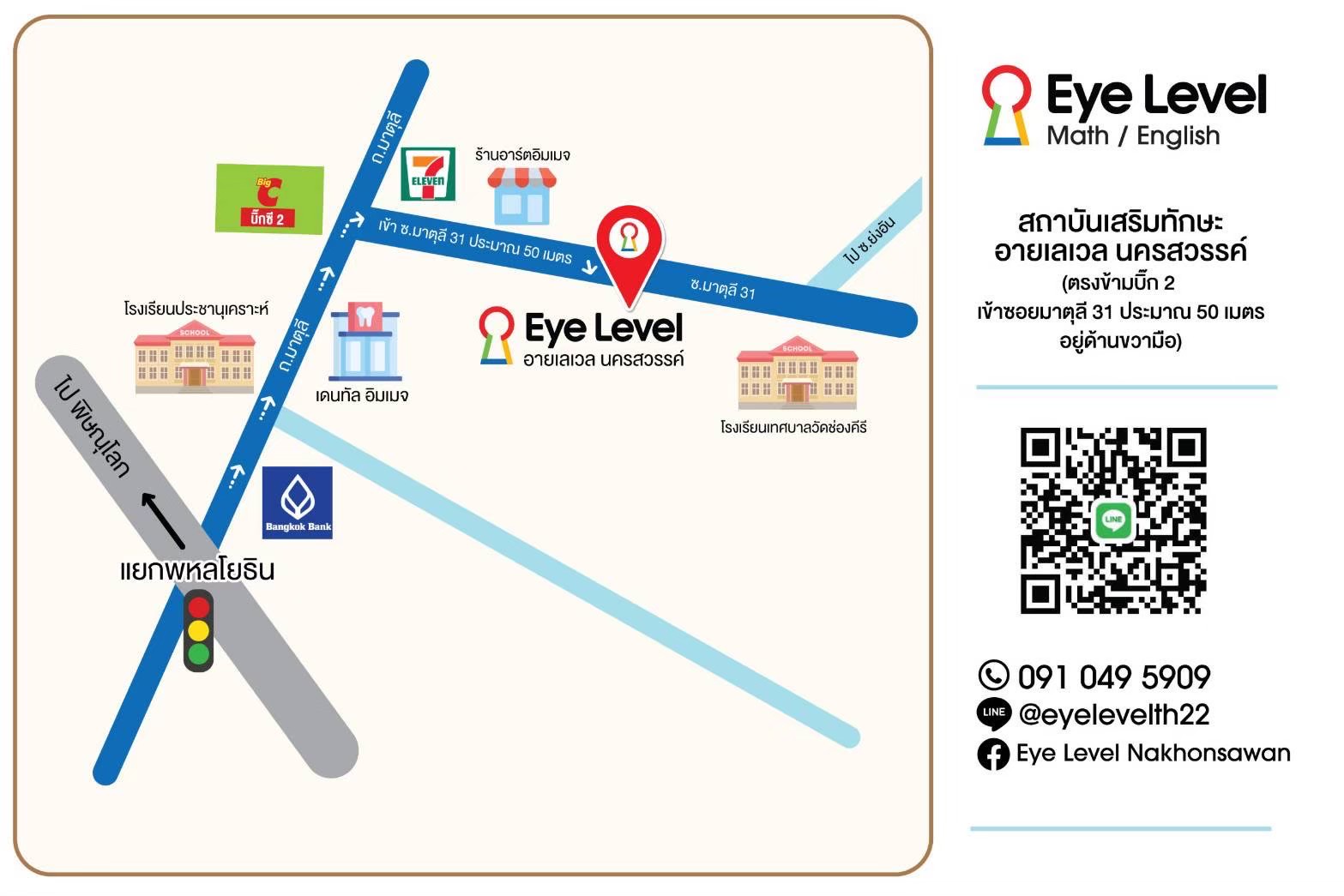 สถาบันเสริมทักษะอายเลเวล (Eye Level) สาขานครสวรรค์ 804/17 หมู่ 10 ซอย มาตุลี 31 ต.นครสวรรค์ตก ตำบลนครสวรรค์ตก อำเภอเมืองนครสวรรค์ จังหวัดนครสวรรค์ 60000 ประเทศไทย
