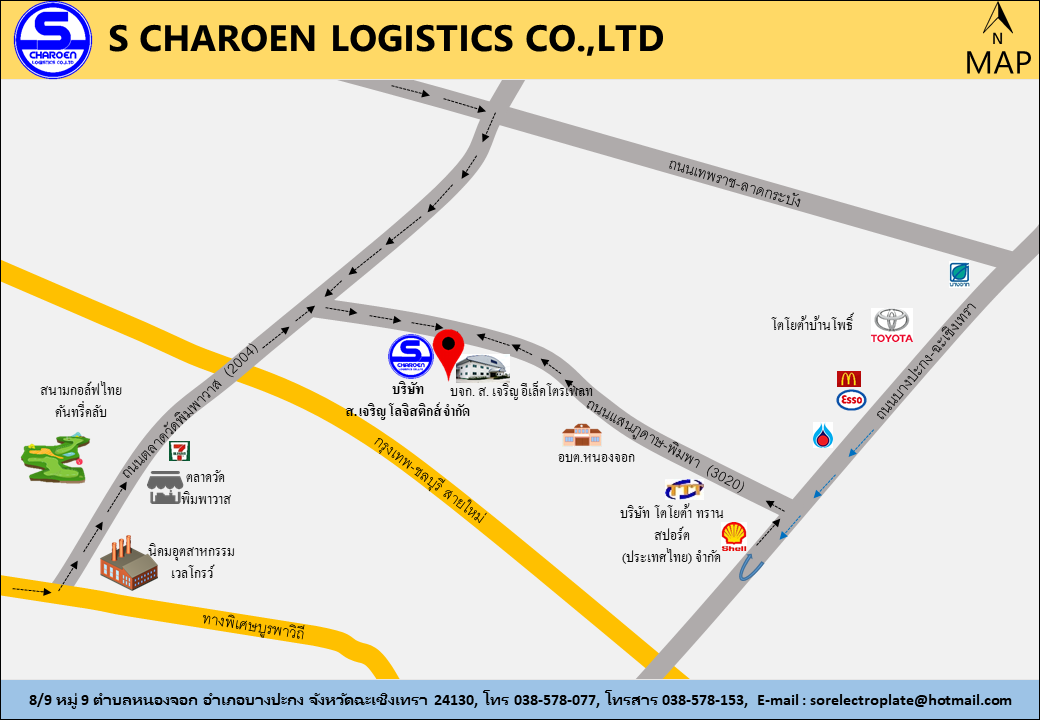 บริษัท ส.เจริญ อีเล็คโตรเพลท จำกัด 8/9 หมู่ 9 ถ.แสนภูดาษ-พิมพา ตำบลหนองจอก อำเภอบางปะกง จังหวัดฉะเชิงเทรา 24130 ประเทศไทย
