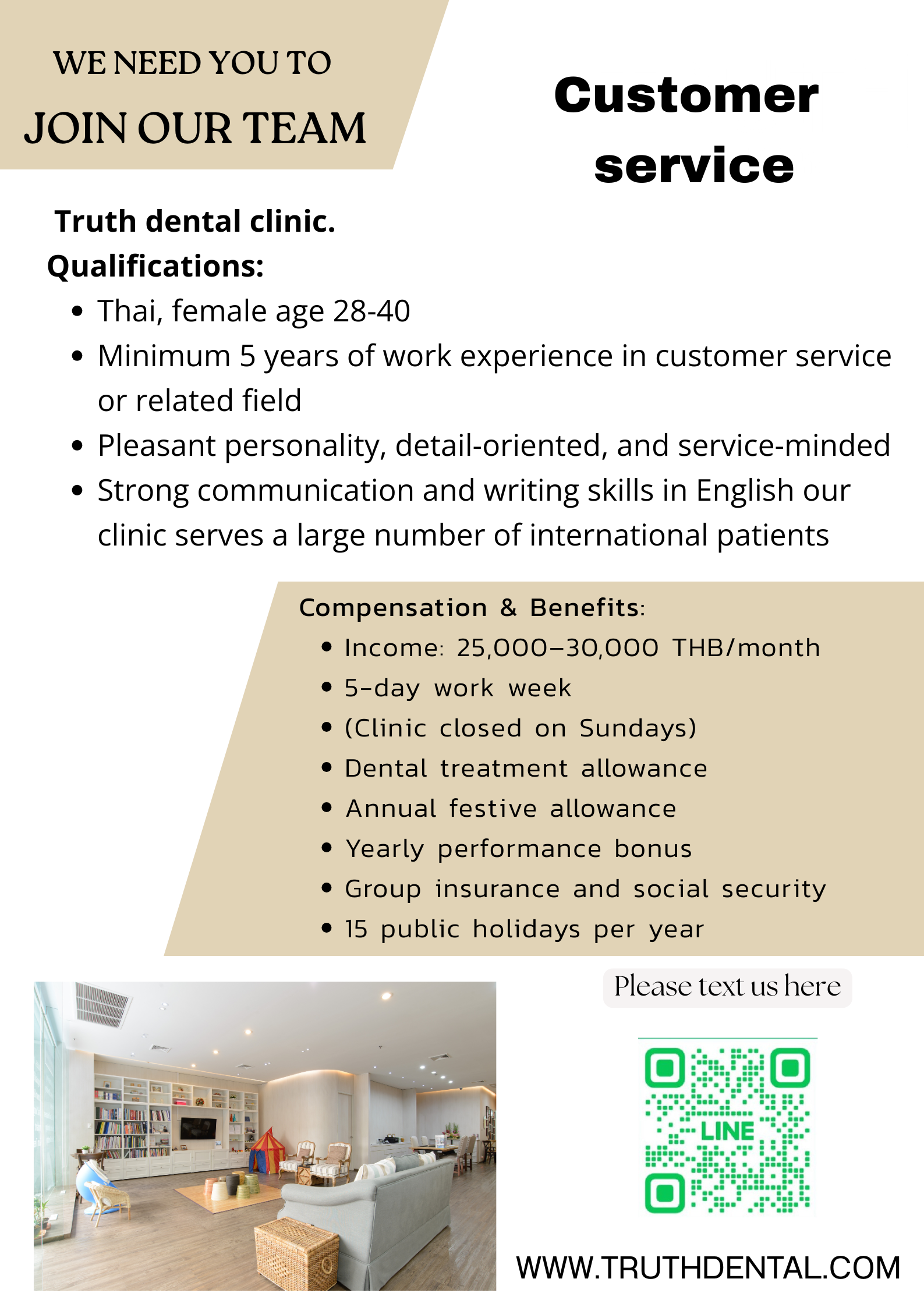 คลินิคทันตกรรมครบวงจรดูแลคนไข้ทั้งคนไทยและต่างชาติด้วยมาตรฐานระดับโลก เปิดทำการมา14ปี มีทันตแพทย์ระดับผู้เชี่ยวชาญแต่ละสาขาเฉพาะทางทางทันตกรรมมามากกว่า30ท่าน เราให้การรักษาทางทันตกรรมโดยมุ่งหวังให้คนไข้มีสุขภาพฟันที่ดีในระยะยาว เราทำงานด้วย ความซื่อสัตย์ ไม่หลอกลวงคนไข้เพื่อผลประโยชน์ทางธุรกิจ ที่ Truth Dental เราสร้างทีมที่ รักการบริการ พัฒนาตัวเองเสมอ และภูมิใจกับงานที่ทำ หากคุณอยากเติบโตไปพร้อมกับทีมที่ให้ความสำคัญกับมาตรฐานและคุณค่าของงานบริการ เรายินดีต้อนรับคุณสู่ Truth Dental