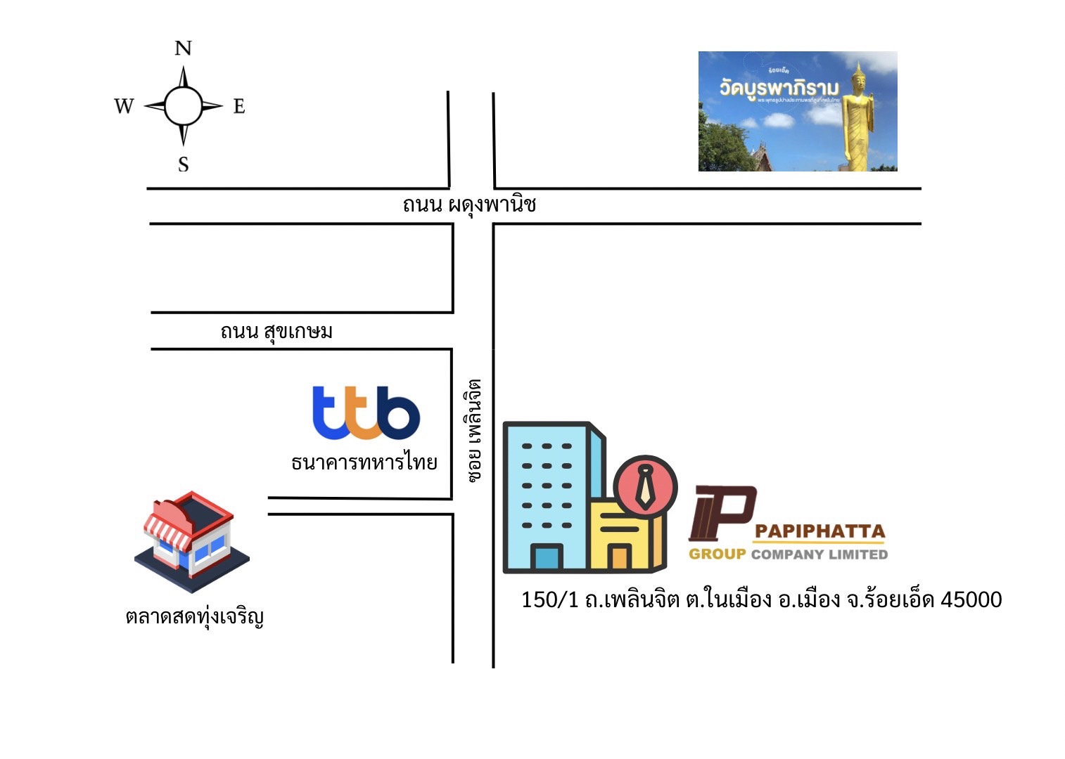 บริษัท พาพิภัฏฏ กรุ๊ป จำกัด สาขาทุ่งเจริญ 150/1 ถนนเพลินจิต ตำบลในเมือง อำเภอเมืองร้อยเอ็ด จังหวัดร้อยเอ็ด 45000 ประเทศไทย