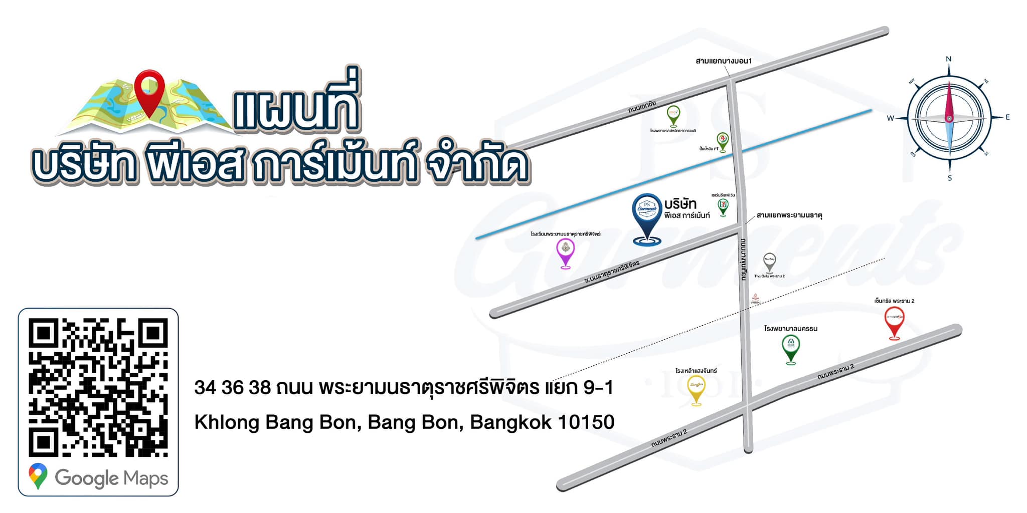 บริษัท พี เอส การ์เม้นท์ 1961 จำกัด 34 36 38 ถนน พระยามนธาตุราชศรีพิจิตร แยก 9-1 แขวงคลองบางบอน เขตบางบอน จังหวัดกรุงเทพมหานคร 10150 ประเทศไทย