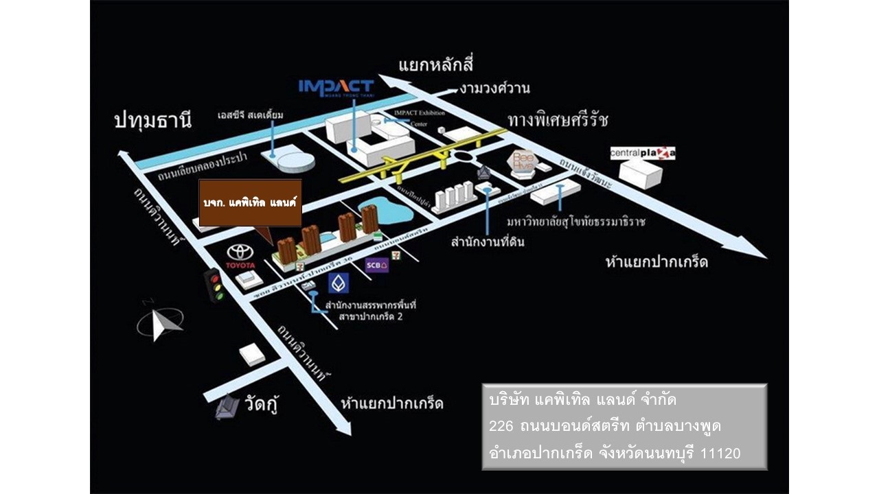 บริษัท แคพิเทิล แลนด์ จำกัด 226 ถ.บอนด์สตรีท ต.บางพูด อ.ปากเกร็ด จ.นนทบุรี ตำบลบางพูด อำเภอปากเกร็ด จังหวัดนนทบุรี 11120 ประเทศไทย