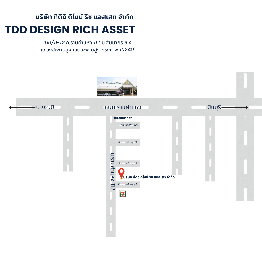 บริษัท ทีดีดี ดีไซน์ ริช แอสเสท จำกัด 160/11-12 ถ.รามคำแหง 112 ม.สัมมากร ซ.4 แขวงสะพานสูง เขตสะพานสูง กรุงเทพมหานคร 10240 แขวงสะพานสูง เขตสะพานสูง จังหวัดกรุงเทพมหานคร 10240 ประเทศไทย