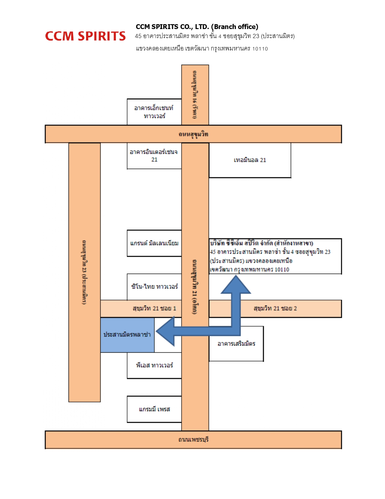 บริษัท ซีซีเอ็ม สปิริต จำกัด สํานักงานแหงใหญ ตั้งอยูเลขที่ 234/1 หมูที่ 1 ตําบลวังขนาย อําเภอทามวง จังหวัดกาญจนบุรี 71110 ตำบลวังขนาย อำเภอท่าม่วง จังหวัดกาญจนบุรี 71110 ประเทศไทย