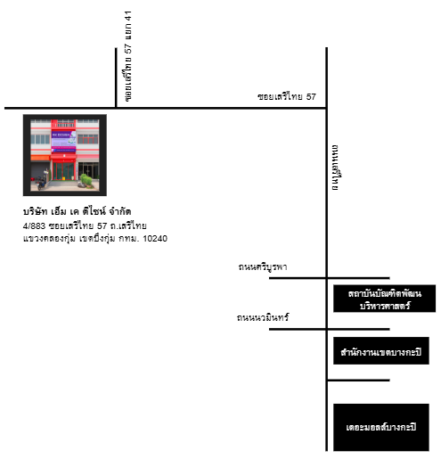 บริษัท เอ็ม เค ดีไซน์ จำกัด 4/883 ซอยเสรีไทย57 แขวงคลองกุ่ม เขตบึงกุ่ม จังหวัดกรุงเทพมหานคร 10240 ประเทศไทย
