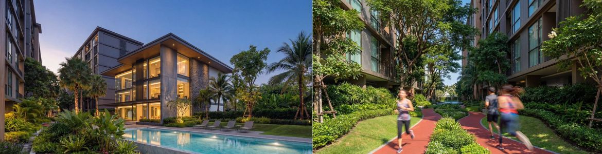 "INSIDE ACELLER HOTEL & RESIDENCE A new definition of restorative living on Phuket’s Wellness Street. Aceller is designed for those who train hard and recover deeper. Every detail supports this intention. Modern architecture in natural calm. Contemporary buildings set within green, shaded spaces. Privacy and tranquility by design. Resort-style pool and recovery zones. Lap pool surrounded by gardens and quiet seating. Spaces built for genuine restoration. Thoughtfully furnished residences. Modern interiors. Fully furnished. Spacious balconies with clear city and mountain views. Facilities for active living. Running track within the project. Distinctive clubhouse at the heart of communal spaces. Soi Ta-iad prime position."