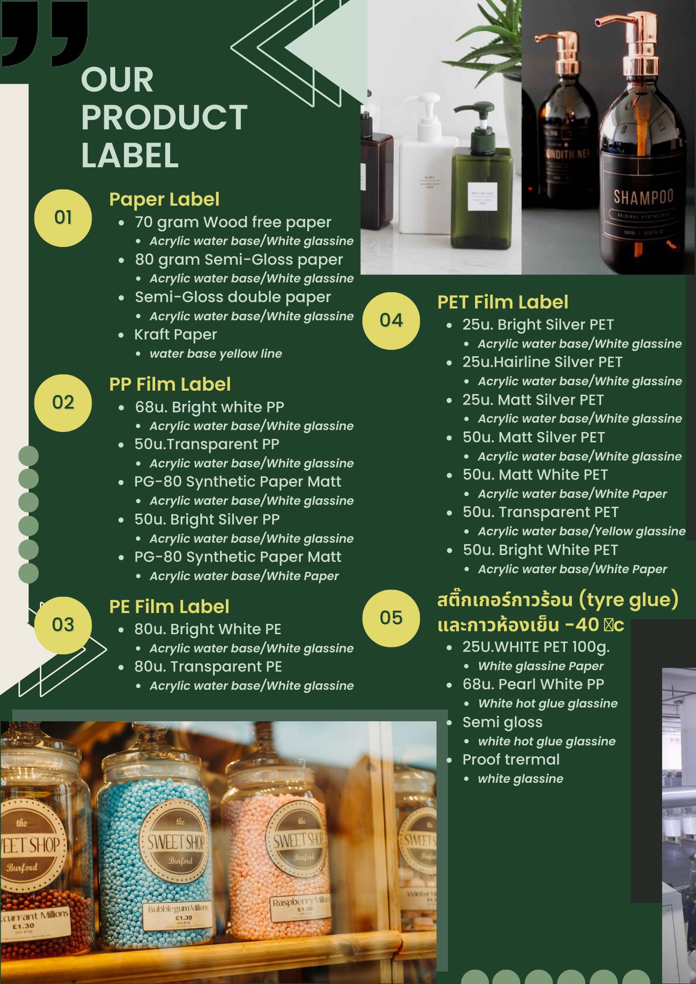 วัสดุสติ้กเกอร์ที่ใช้ในการพิมพ์ของเรามาจากผู้ผลิตทั่วโลกที่เป็นมืออาชีพ ที่มีการค้นคว้า และพัฒนาผลิตภัณฑ์อย่างต่อเนื่อง และมีกระบวนการผลิตที่มีมาตรฐาน และเป็นมิตรกับสิ่งแวดล้อม โดยเน้นพัฒนากลุ่มผลิตภัณฑ์ที่เป็นวัสดุสติ้กเกอร์ กระดาษ และฟิล์มอาทิ เช่น พีพี พีอี พีอีที กาวร้อน กาวห้องเย็น ที่ถูกใช้อย่างกว้างขวางในอุตสาหกรรมต่างๆ เช่น เภสัชกรรม อิเล็กทรอนิกส์ อาหารและเครื่องดื่ม เครื่องสำอาง การขนส่ง และซูเปอร์มาเก็ต เป็นต้น