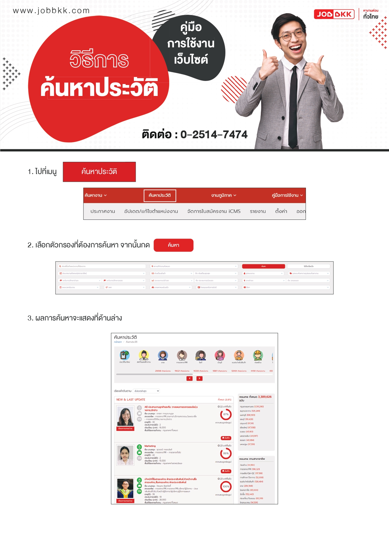 ท่านผู้ประกอบการสามารถค้นหาเรซูเม่ผู้สมัครที่ลงประวัติไว้ได้ที่เมนู "ค้นหาประวัติ"