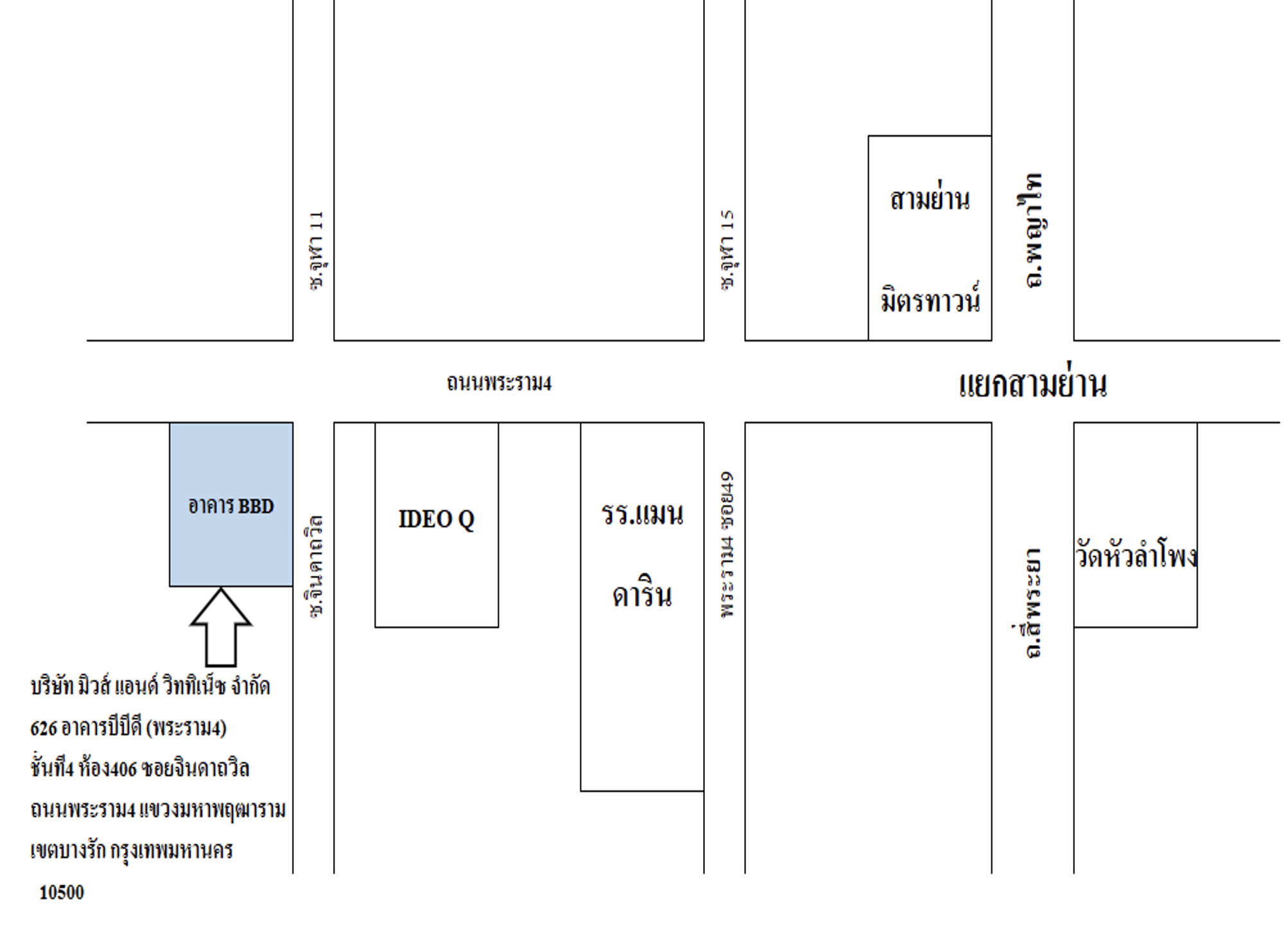 626 อาคารบีบีดี (พระราม 4) ชั้นที่ 4 ห้องเลขที่ 406 ซอยจินดาถวิล ถนนพระราม 4 แขวงมหาพฤฒาราม เขตบางรัก จังหวัดกรุงเทพมหานคร 10500 ประเทศไทย