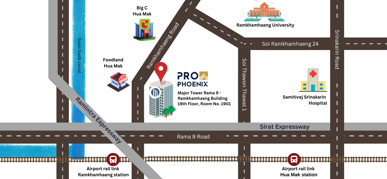 เลขที่ 51 อาคารเมเจอร์ ทาวเวอร์ พระราม 9 - รามคำแหง ชั้น 19 ห้องเลขที่ 1901 ถนนพระราม 9 แขวงหัวหมาก เขตบางกะปิ จังหวัดกรุงเทพมหานคร 10240 ประเทศไทย
