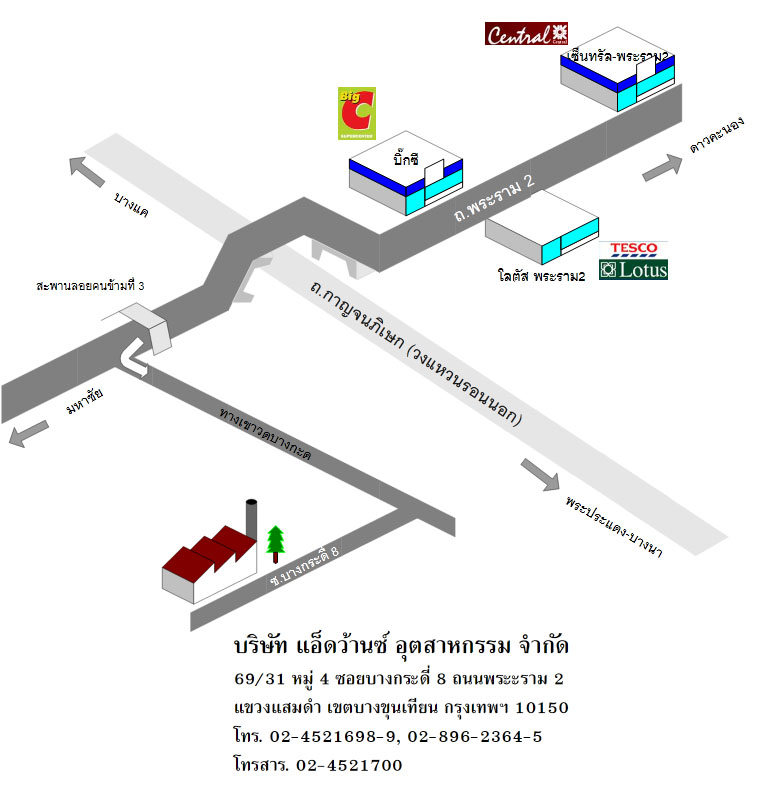 การเดินทางเพิ่มเติม : จากถนนพระราม 2 มุ่งหน้าสู่มหาชัย ขับขึ้นสะพานข้ามวงแหวน แล้วออกทางออกทางคู่ขนานอันแรกหลังจากลงสะพาน เลี้ยวซ้ายเข้า ซอยบางกระดี่ ตรงมาเรื่อยๆ เข้ามาในซอย แล้วมองหาซอยบางกระดี่ 8 ด้านขวามือ บริษัทอยู่ห่างจากปากซอยประมาณ 400 เมตร ด้านขวามือประตูรั้วสีส้ม
