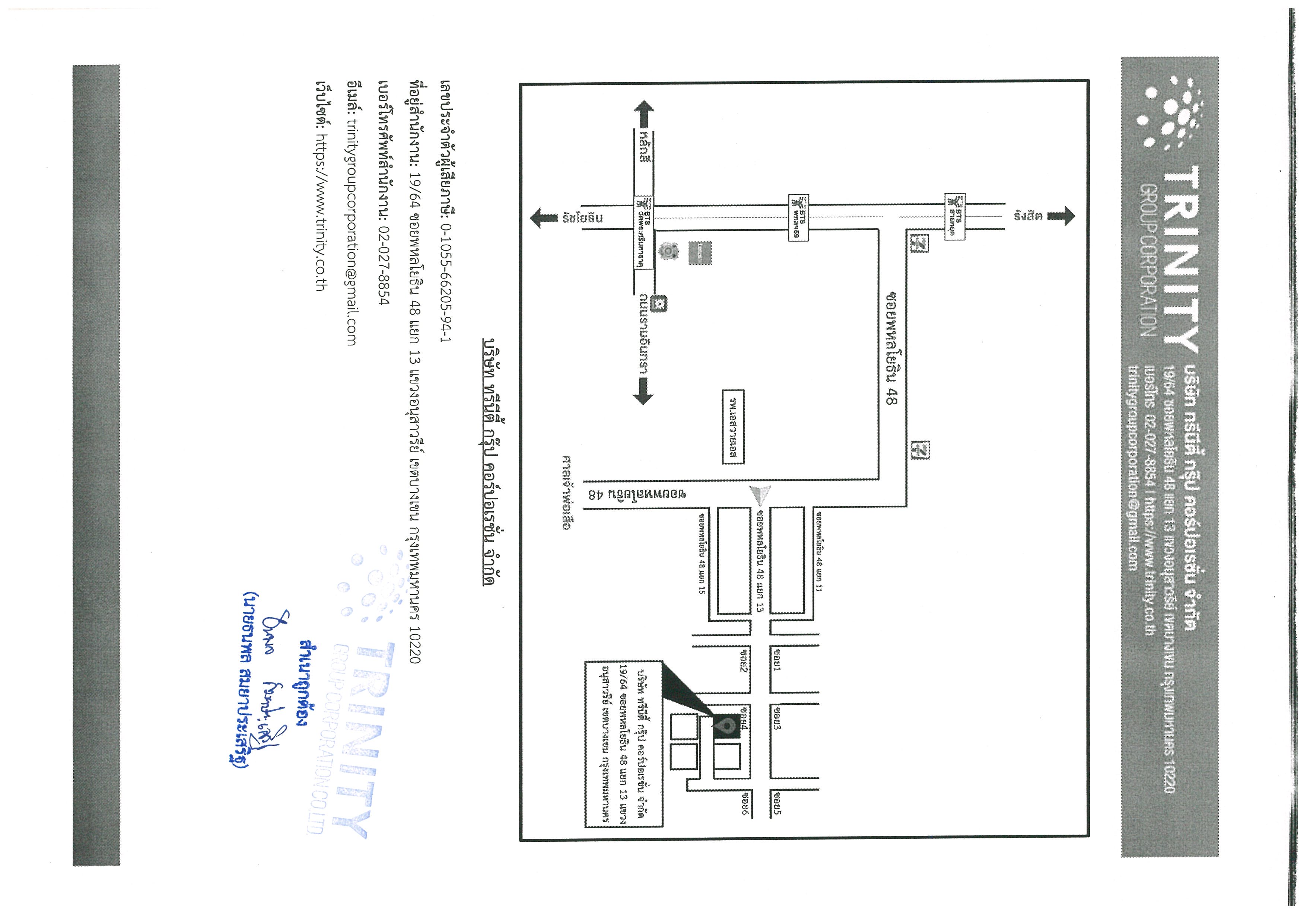 บริษัท ทรีนีตี้ กรุ๊ป คอร์ปอเรชั่น จำกัด 19/64 ซ.พหลโยธิน 48 แยก 13 แขวงอนุสาวรีย์ เขตบางเขน กรุงเทพมหานคร 10220 แขวงอนุสาวรีย์ เขตบางเขน จังหวัดกรุงเทพมหานคร 10220 ประเทศไทย