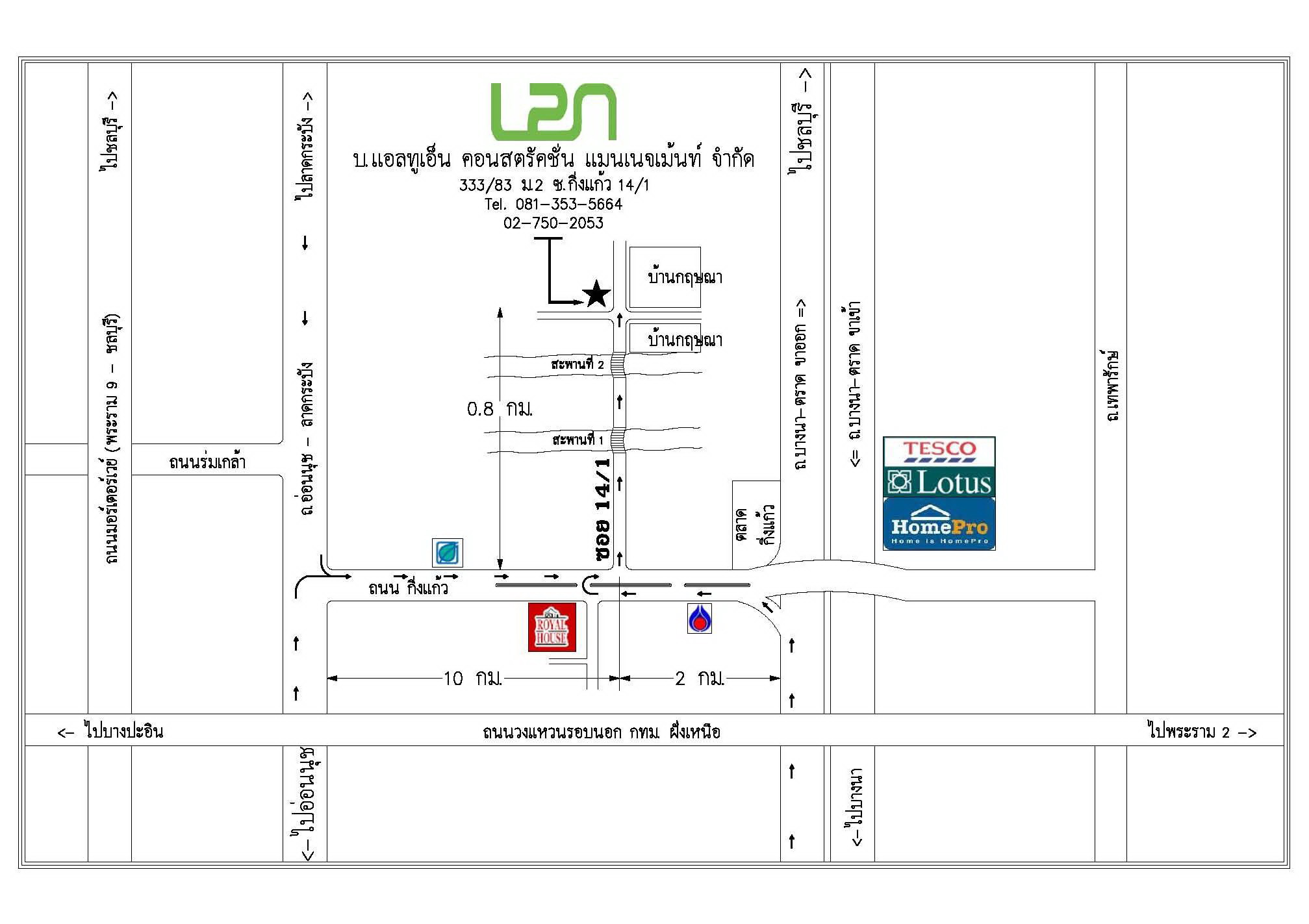 บริษัท แอลทูเอ็น คอนสตรัคชั่น แมนเนจเม้นท์ จำกัด 333/83 ม.2 ซอยกิ่งแก้ว 14/1 ถ.กิ่งแก้ว ต.ราชาเทวะ อ.บางพลี จ.สมุทรปราการ **สายรถประจำทาง : ปอ.553 (ผ่านเส้น ถ.กิ่งแก้ว) ปอ.552, ปอ.558, ปอ.537, 365 (นั่งรถสองแถวต่อเ ตำบล อำเภอ จังหวัดสมุทรปราการ 10540 ประเทศไทย