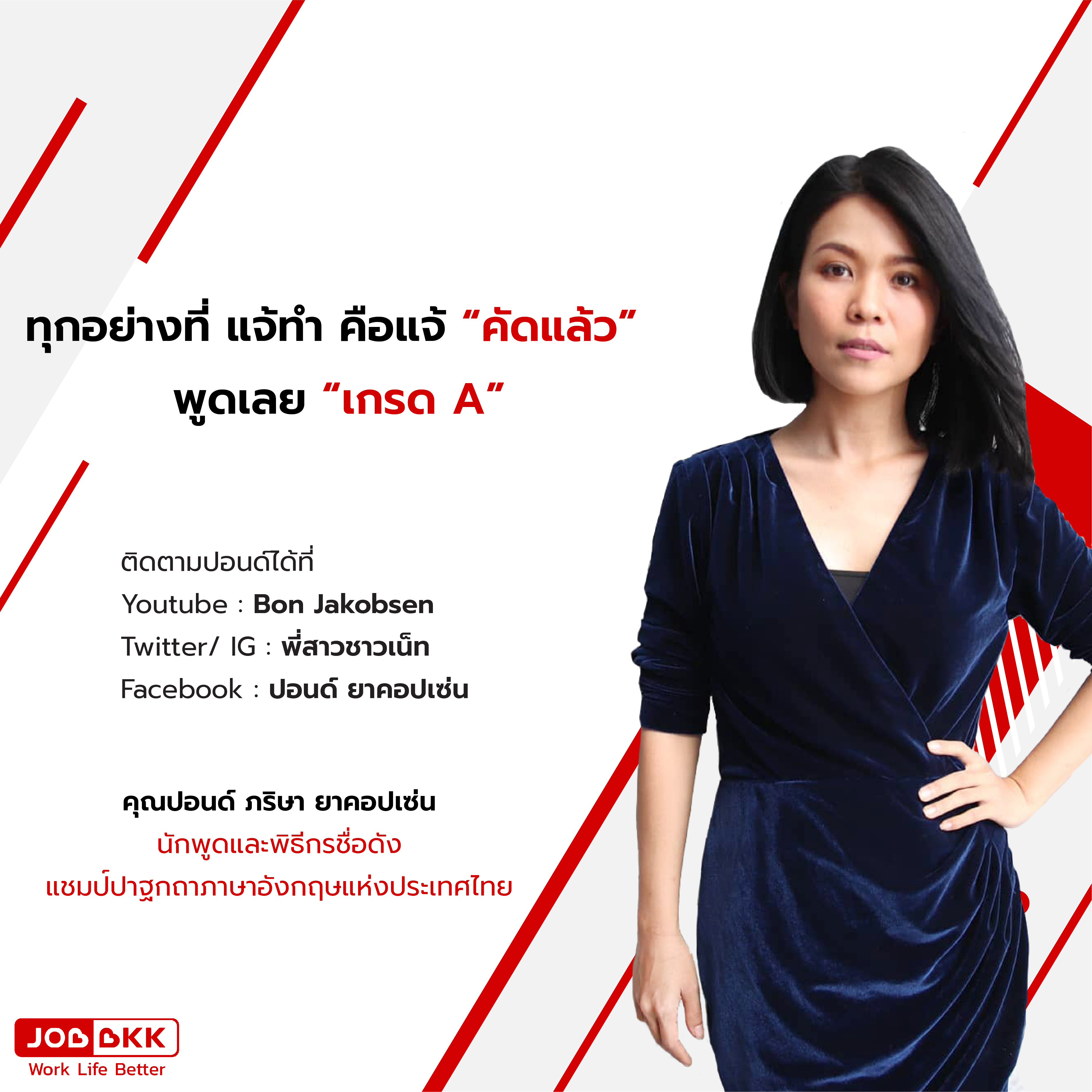 ภาษาไทย คู่แข่งคุณเต็มท้องตลาดไปหมด แต่ถ้าได้ 2 ภาษา คู่แข่งหายไปเลย 80% ดังนั้น ความสามารถในการพูดภาษาอังกฤษจึงเป็นการสร้างมูลค่าให้กับตัวเองค่ะ